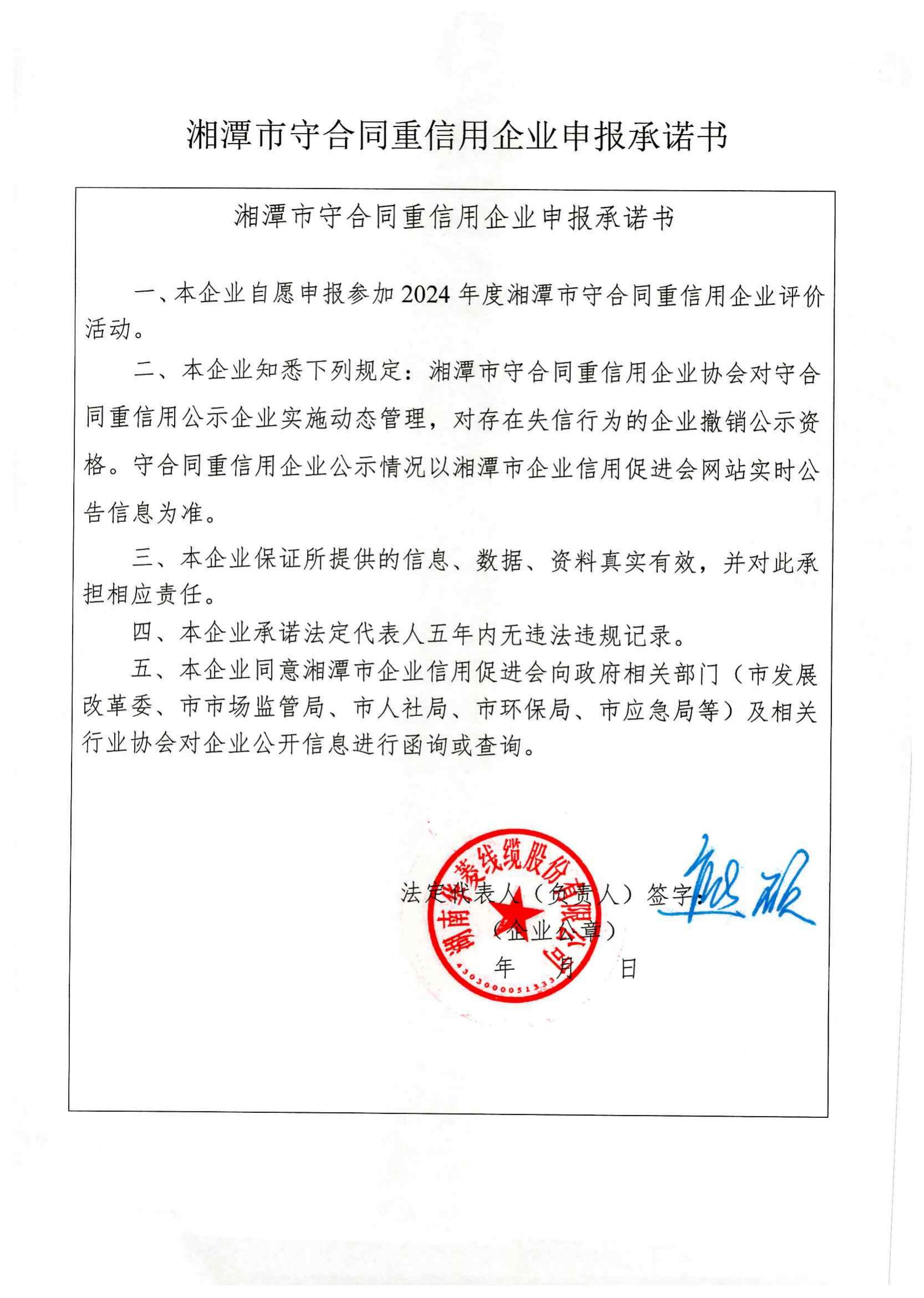 本企業(yè)根據《湘潭市守合同重信用企業(yè)申報規(guī)定》等編制 2024 年度企業(yè)信用報告書,并保證本報告書內容真實、準確、完整。