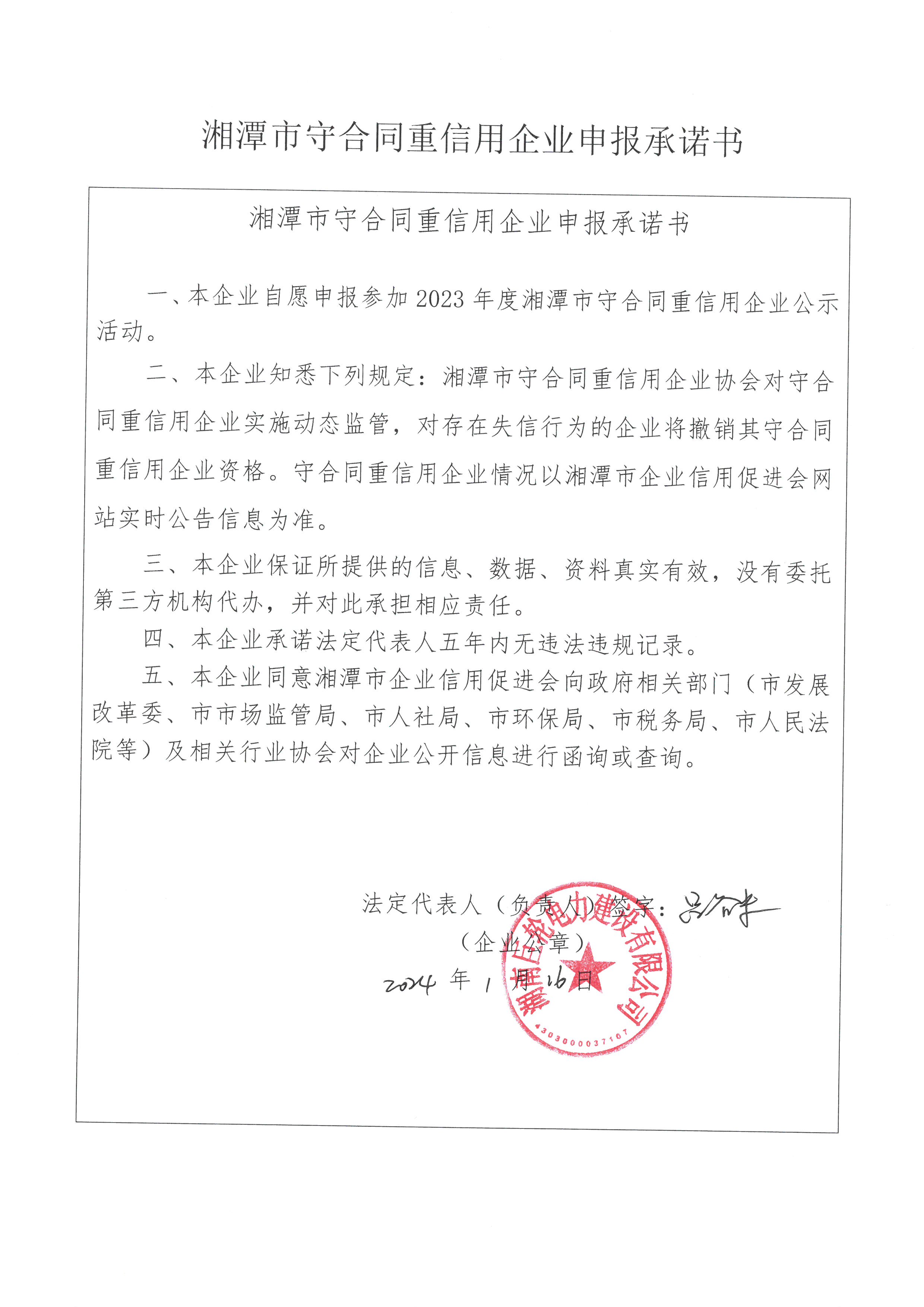 本企業(yè)根據《湘潭市守合同重信用企業(yè)申報規(guī)定》等編制 2023 年度企業(yè)信用報告書,并保證本報告書內容真實、準確、完整。