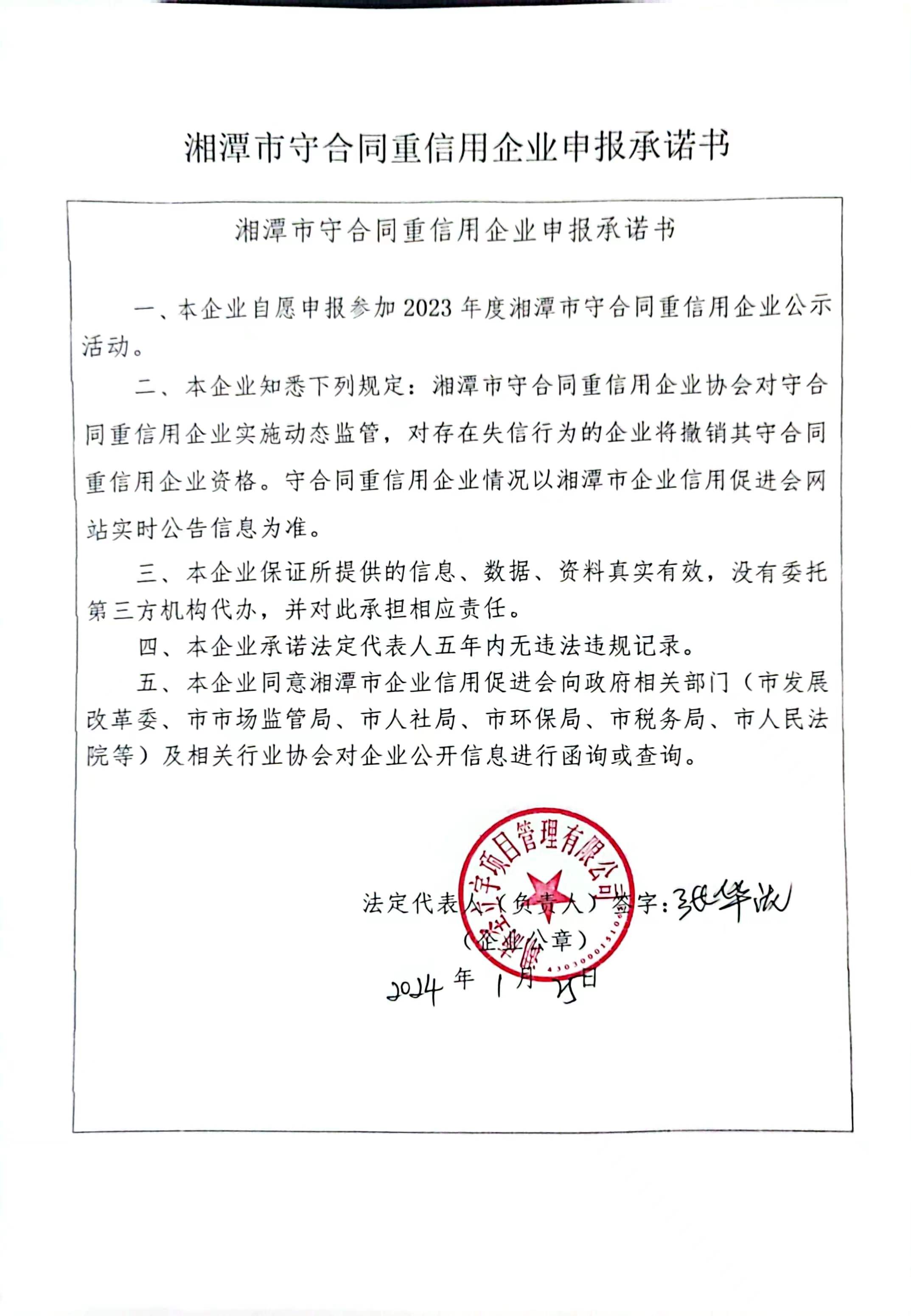 本企業(yè)根據(jù)《湘潭市守合同重信用企業(yè)申報規(guī)定》等編制 2023 年度企業(yè)信用報告書,并保證本報告書內(nèi)容真實、準確、完整。