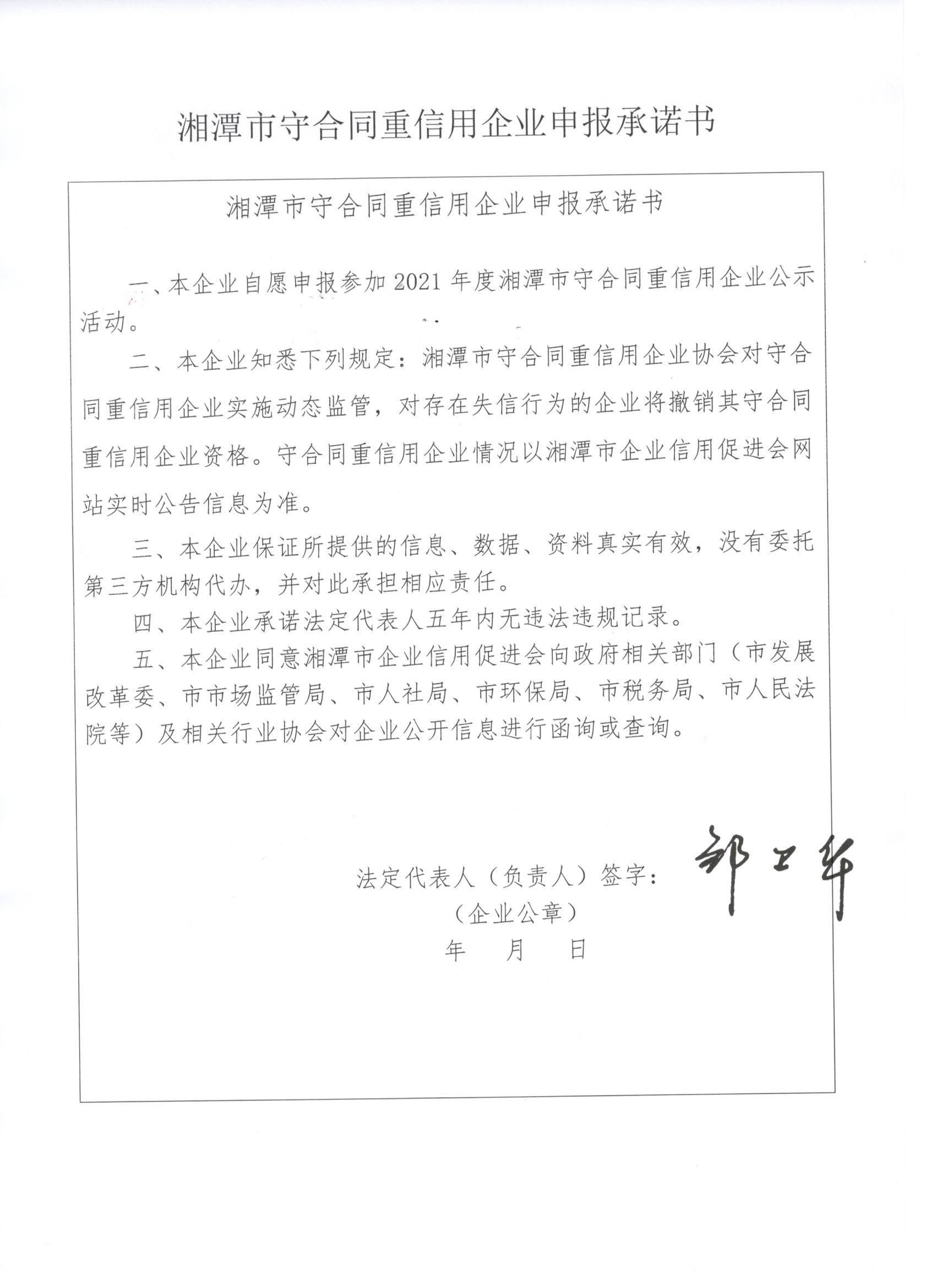 本企業(yè)根據(jù)《湘潭市守合同重信用企業(yè)申報規(guī)定》等編制 2021 年度企業(yè)信用報告書,并保證本報告書內(nèi)容真實(shí)、準(zhǔn)確、完整。