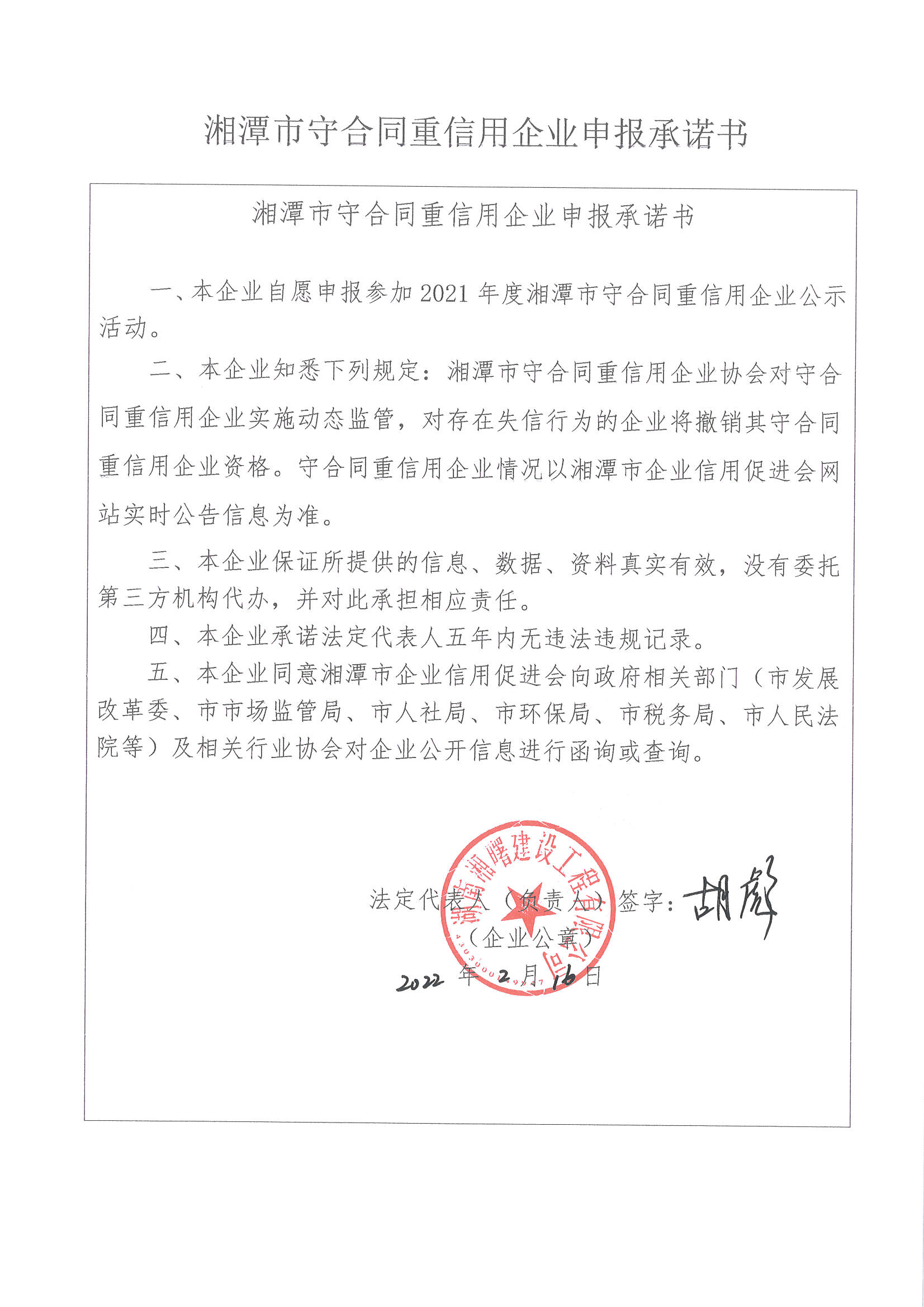本企業(yè)根據(jù)《湘潭市守合同重信用企業(yè)申報規(guī)定》等編制 2021 年度企業(yè)信用報告書,并保證本報告書內(nèi)容真實、準(zhǔn)確、完整。