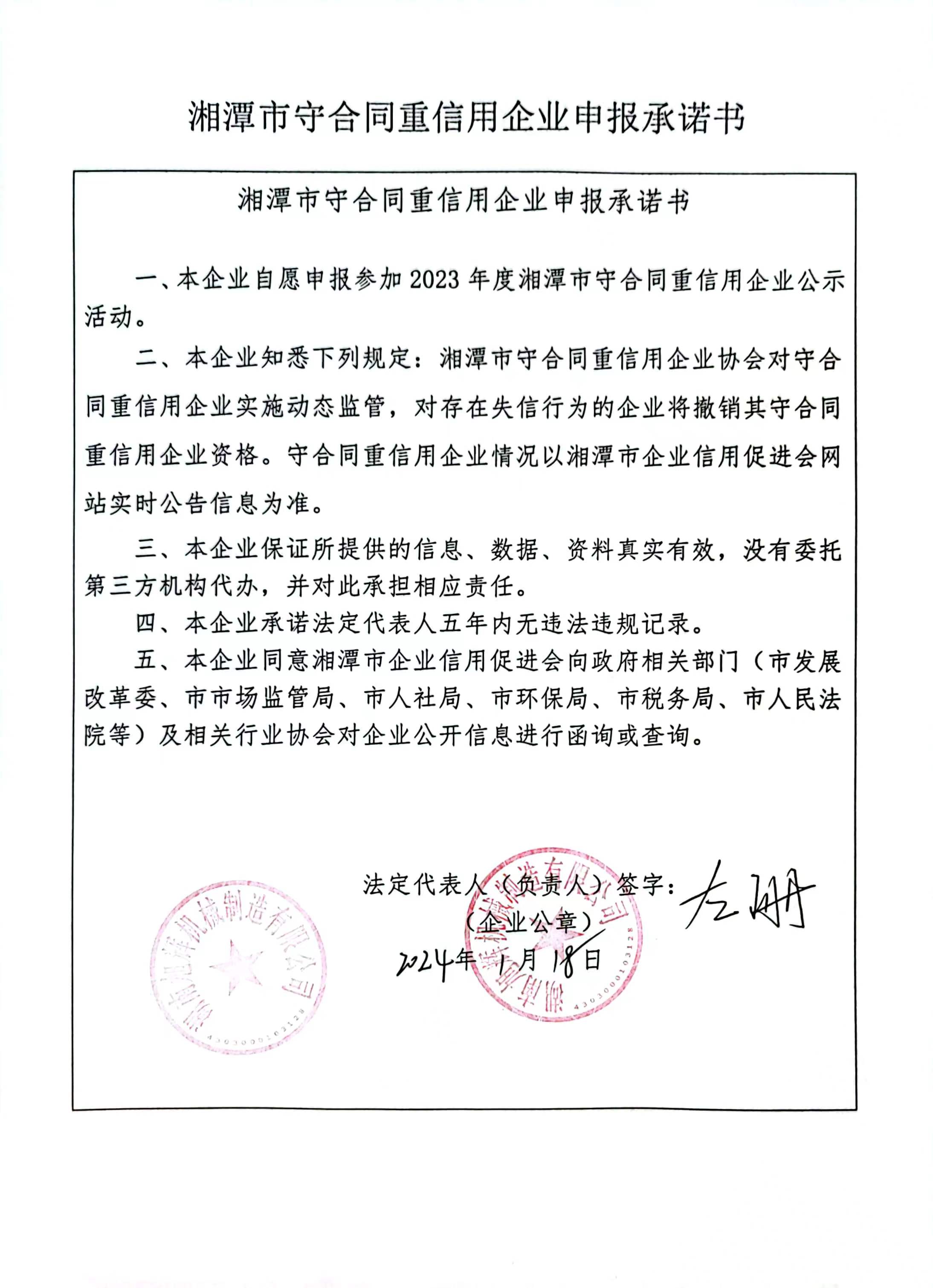 本企業(yè)根據(jù)《湘潭市守合同重信用企業(yè)申報(bào)規(guī)定》等編制 2023 年度企業(yè)信用報(bào)告書,并保證本報(bào)告書內(nèi)容真實(shí)、準(zhǔn)確、完整。