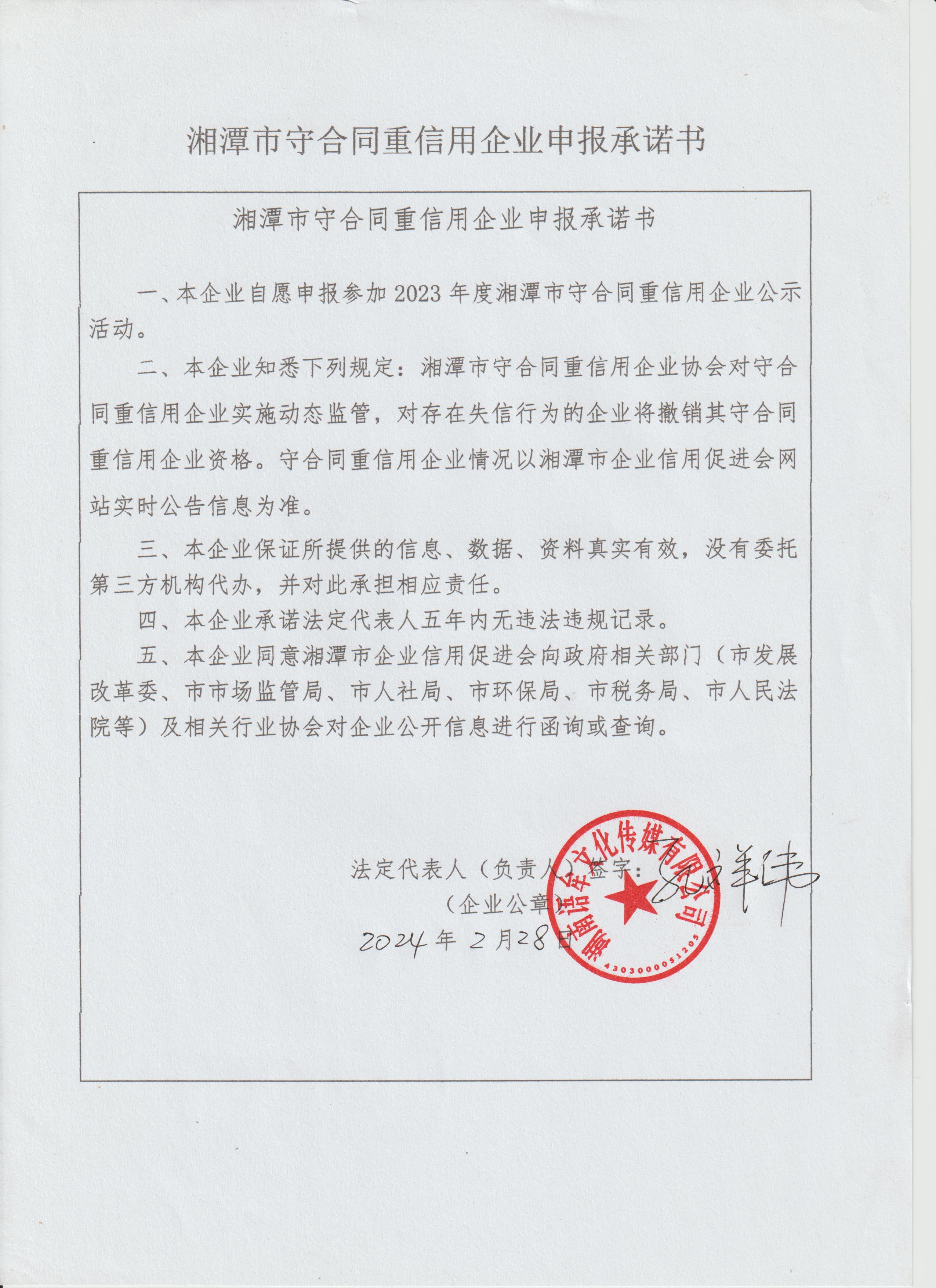 本企業(yè)根據(jù)《湘潭市守合同重信用企業(yè)申報規(guī)定》等編制 2023 年度企業(yè)信用報告書,并保證本報告書內(nèi)容真實、準(zhǔn)確、完整。