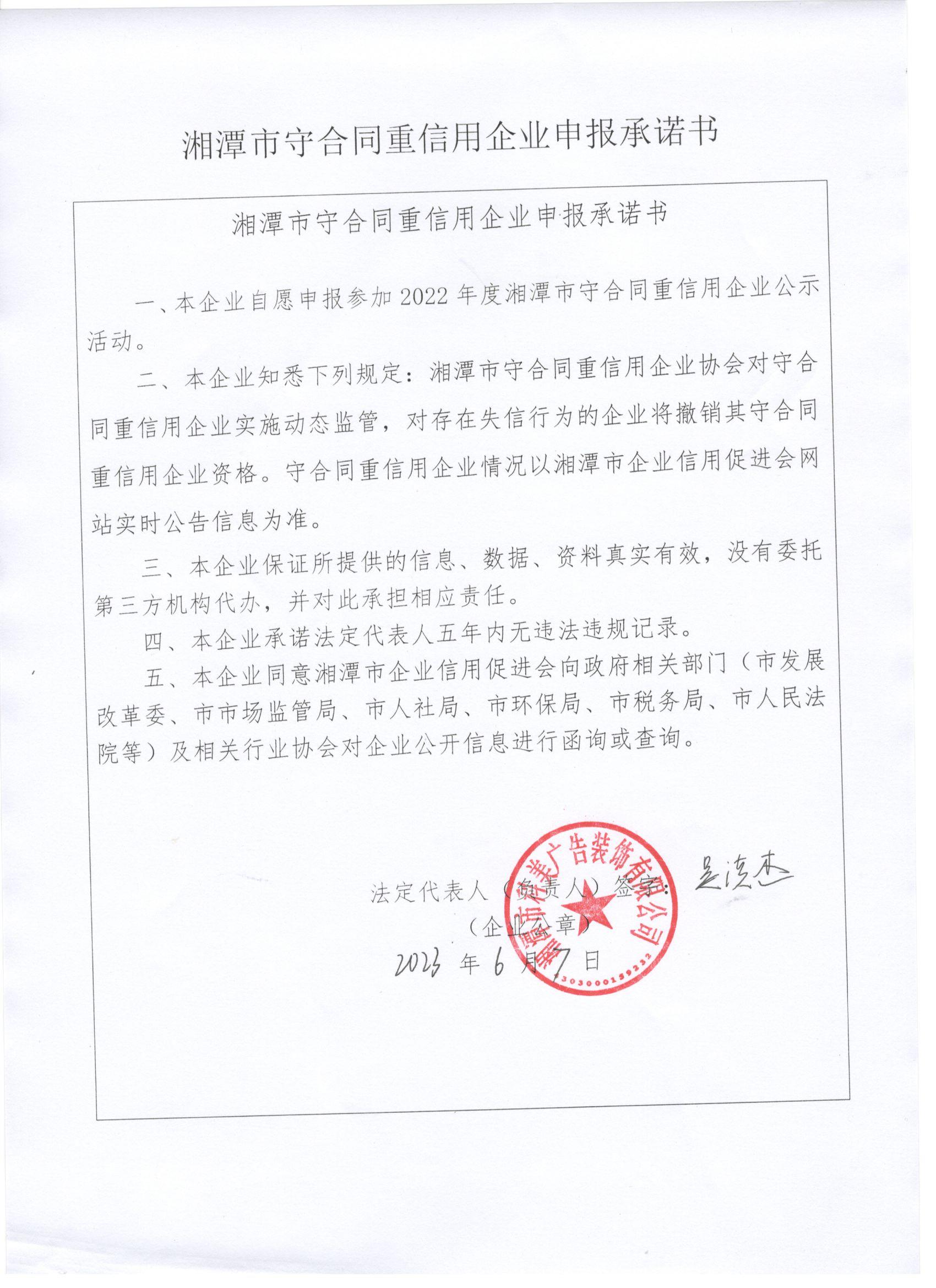 本企業(yè)根據(jù)《湘潭市守合同重信用企業(yè)申報規(guī)定》等編制 2022 年度企業(yè)信用報告書,并保證本報告書內容真實、準確、完整。
